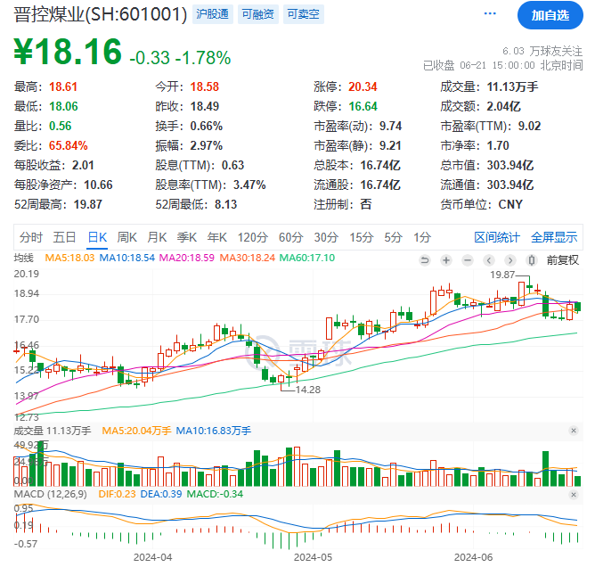 收尾6月21日收盘,晋控煤业股价为18.16元/股,当日跌幅为1.78%,总市值为304亿元。