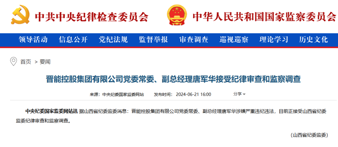 6月21日,中央纪委国度监委官网通报,晋能控股集团有限公司党委常委、副总司理唐军华涉嫌严重违法犯法,现在正接受山西省纪委监委规律审查和监察造访。